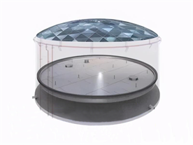 全接液內(nèi)浮盤(pán)指內(nèi)浮盤(pán)本體漂浮在液體中有一定的浸液高度,浮力單元之間及與各部件的連接部位有可靠的密封措施,形成底部全域浸入液體的內(nèi)浮盤(pán)。全浸液內(nèi)浮盤(pán)包括箱體式、浮艙式、玻璃鋼復(fù)合材料式、全焊接蜂巢芯式及其他形式的裝配式全浸液內(nèi)浮頂。全接液內(nèi)浮盤(pán)適用于儲(chǔ)罐內(nèi)直徑5m~48m。